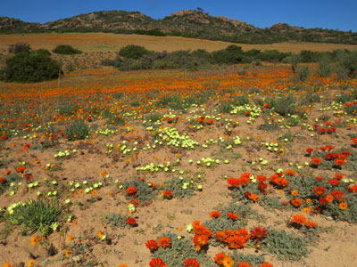 ナマクワランドは南アフリカの北西部 北ケープ州にあり、春の2週間だけ花畑が出現します。 1年の大半が砂と岩山に囲まれた土地が、一面のお花畑に変身します。 今回は付近地のグーキャップ自然保護区・オキップ・マイキーズファウンテンで見た花も紹介します ナマクワランドだけでも 3,800種のワイルドフラワーがありますが、西遊旅行の紹介で事前購入した 立派なNAMAQUALANDの花図鑑でも掲載は900種のみ、他種との区別ポイントも未記載なので 多くの花が花名同定が不確実です。 |